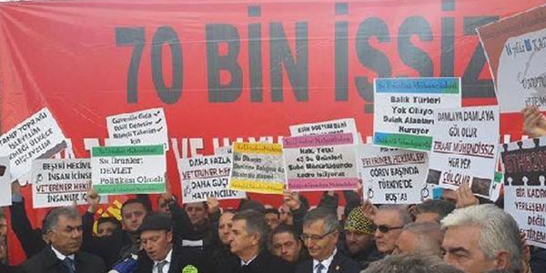 Abdi İpekçi Parkı'nda bir araya gelen Gıda, Su Ürünleri, Ziraat, Balıkçılık Teknolojisi Mühendisleri, Veterinerler ile Teknikerler "70 bin işsiz 20 bin boş kadroya atama bekliyor" yazılı afiş açtı.