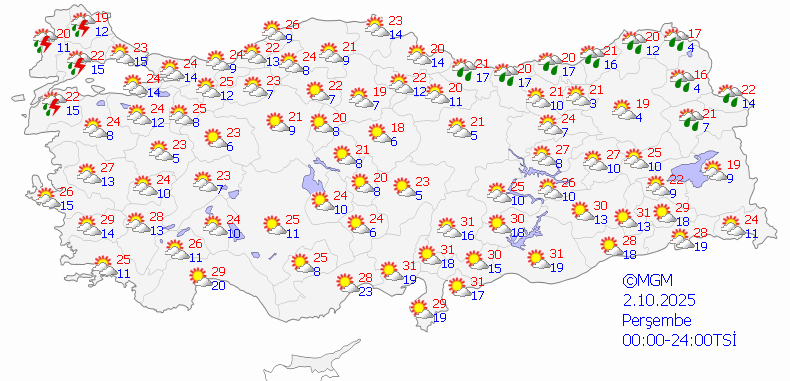 Meteoroloji Genel Müdürlüğü tarafından yapılan son tahminlere göre, ülkemizin kuzey, iç ve doğu kesimlerinde parçalı ve yer yer çok bulutlu bir hava bekleniyor. Batı Karadeniz, Orta ve Doğu Karadeniz kıyıları ile Hatay, Artvin, Kars, Ardahan, Iğdır, Van, Bitlis çevreleri, Çorum'un kuzey kesimleri, Erzurum ve Ağrı'nın doğusu sağanak ve gök gürültülü sağanak yağışlı geçecek. Diğer bölgelerde ise hava az bulutlu ve açık olacak. Hava sıcaklıklarının kuzeyde mevsim normallerinin altında, diğer bölgelerde ise normaller civarında seyretmesi bekleniyor.