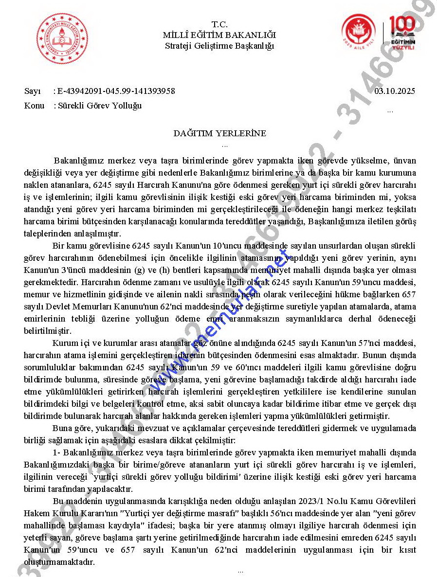Milli Eğitim Bakanlığı Strateji Geliştirme Başkanlığı 03.10.2025 tarih ve 141393958 sayılı yazılarıyla tüm il milli eğitim müdürlüklerine; Milli Eğitim Bakanlığı merkez veya taşra birimlerinde görev yapmakta iken görevde yükselme, ünvan değişikliği veya yer değiştirme gibi nedenlerle Bakanlığımız birimlerine ya da başka bir kamu kurumuna naklen atananlara, 6245 sayılı Harcırah Kanunu'na göre ödenmesi gereken yurt içi sürekli görev harcırahı iş ve işlemlerinin; ilgili kamu görevlisinin ilişik kestiği eski görev yeri harcama biriminden mi, yoksa atandığı yeni görev yeri harcama biriminden mi gerçekleştirileceği ile ödeneğin hangi merkez teşkilatı harcama birimi bütçesinden karşılanacağını bildirdi
