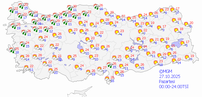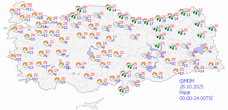 Marmara'nın doğusu ile Batı Karadeniz'de beklenen kuvvetli yağış nedeniyle 11 il için "sarı" kodlu uyarı yapıldı. Meteoroloji Genel Müdürlüğü tarafından yapılan tahminlere göre, yurt genelinin parçalı ve yer yer çok bulutlu olacağı, Marmara'nın güney ve doğusu, Kıyı Ege, Karadeniz ile Ankara'nın kuzeyi, Hatay kıyıları, Sivas, Çankırı, Antalya, Adana, Osmaniye, Ardahan ve Kars çevrelerinde yağmur ve sağanak yağış görüleceği bildirildi. Ayrıca, Doğu Karadeniz'in iç kesimlerinin yüksekleri ile Doğu Anadolu'nun kuzeydoğusunun yükseklerinde karla karışık yağmur bekleniyor.