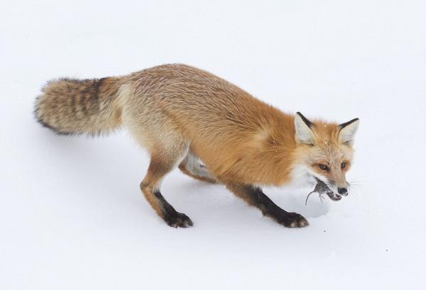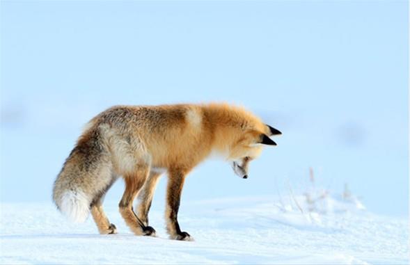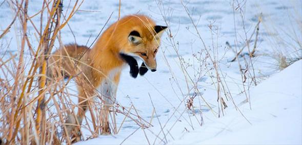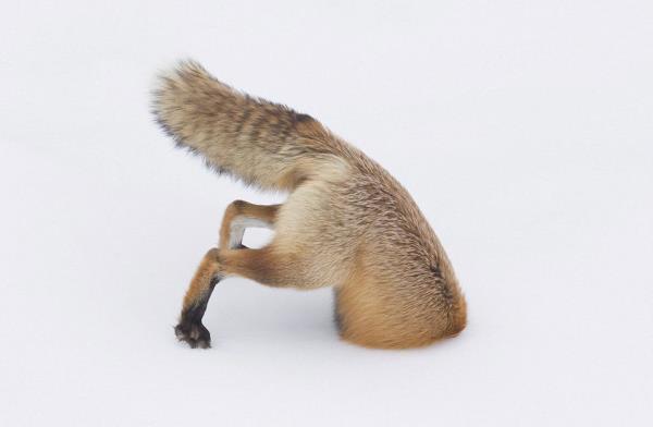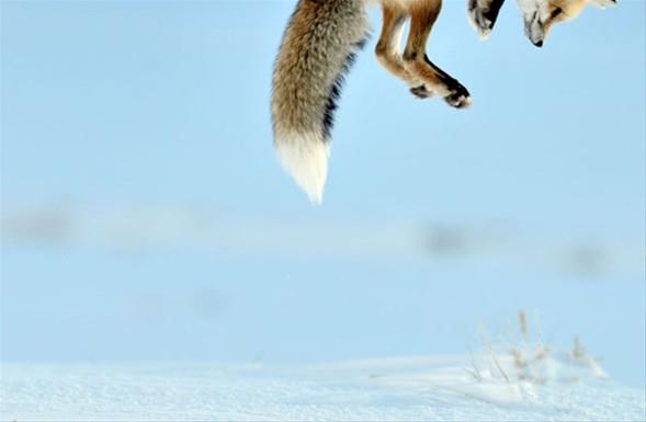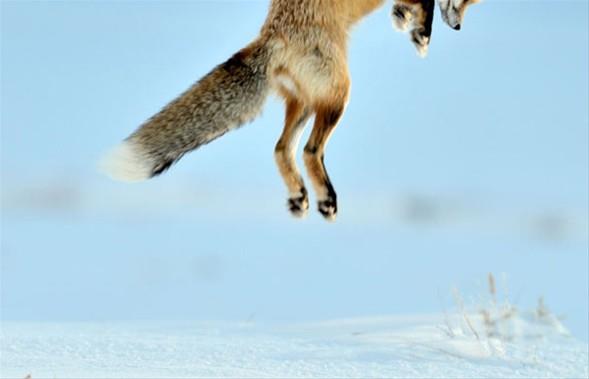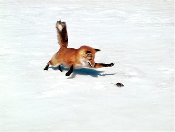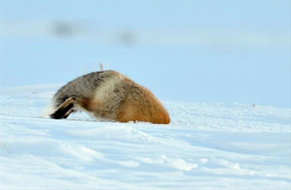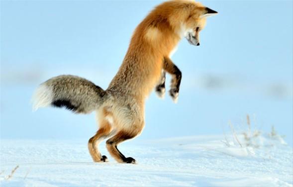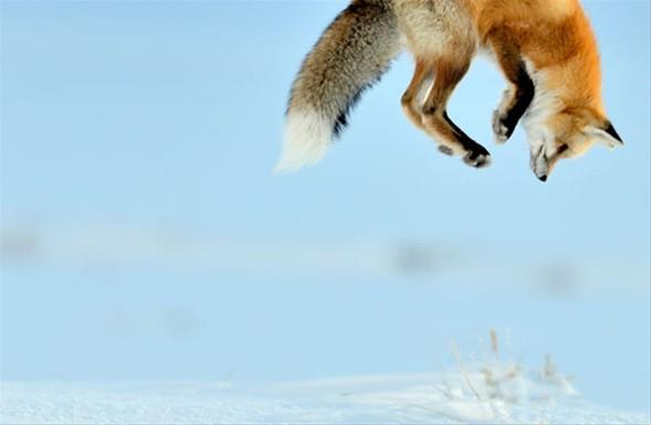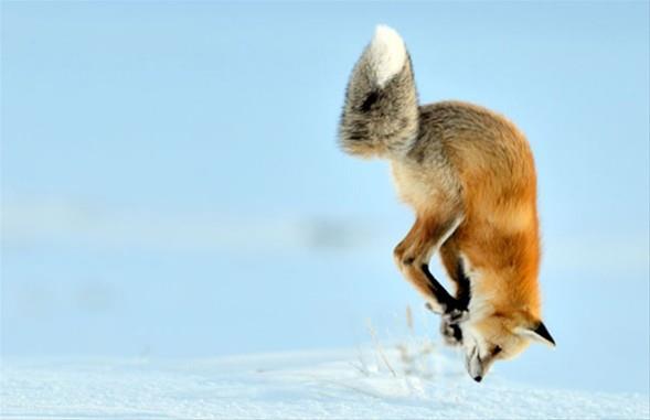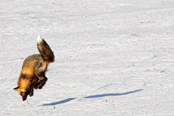 Tilki karın altında bulunan farenin sesini takip ediyor ve sıçrayıp karın altına dalıyor.