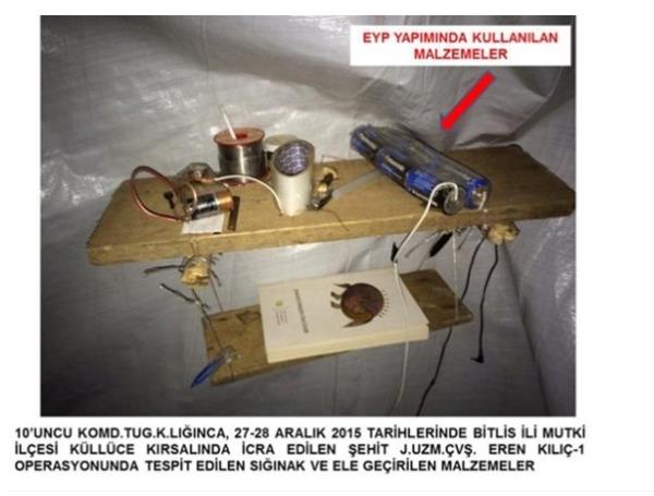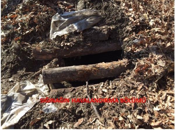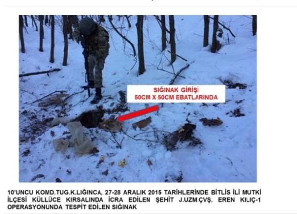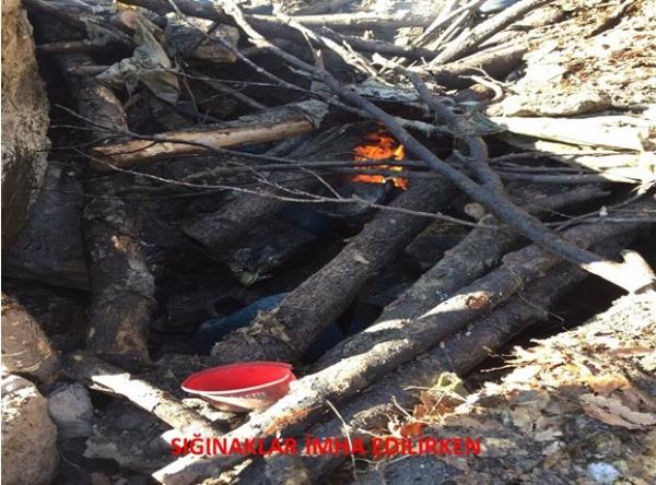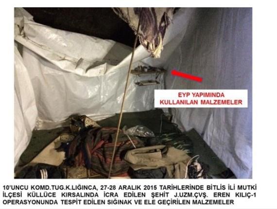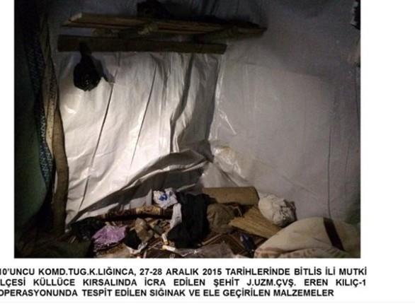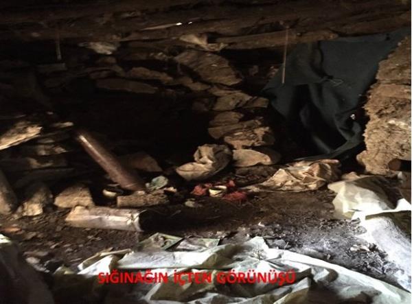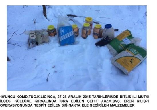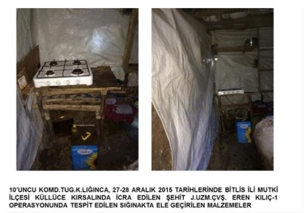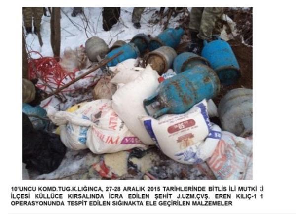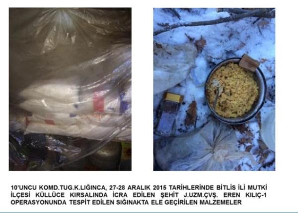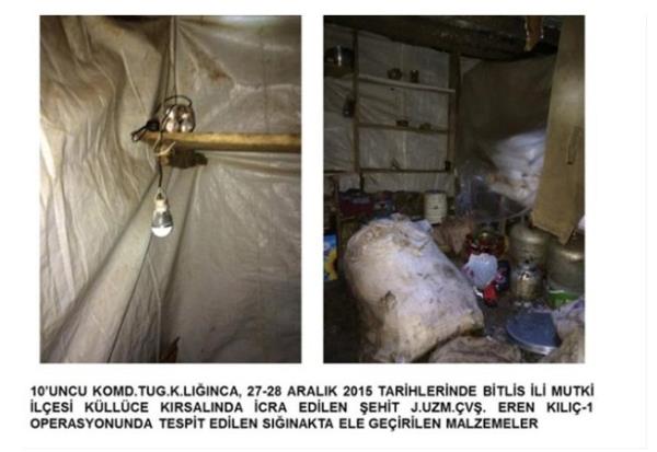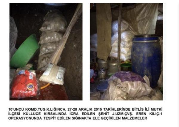 Bitlis'in Mutki ilçesi kırsalında tespit edilen bir sığınakta terör örgütüne ait patlayıcı yapımında kullanılan malzeme, çok sayıda yaşam malzemesi ve bir Kürtçe İncil çıktı.