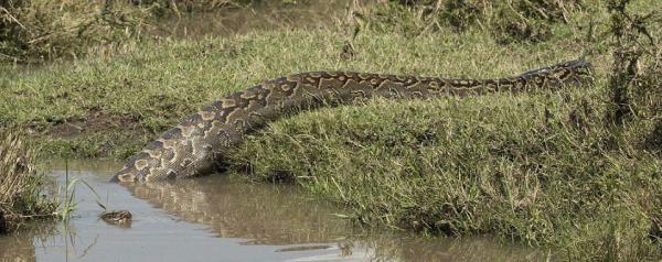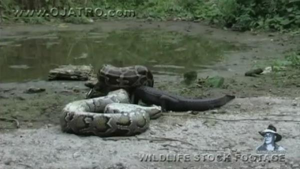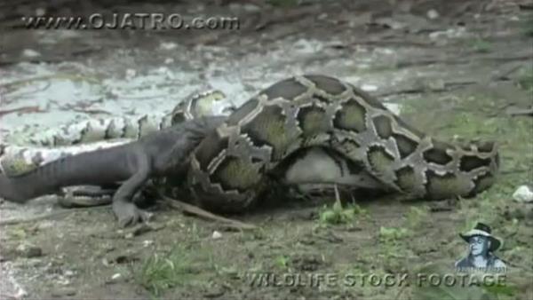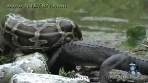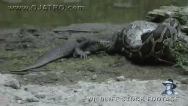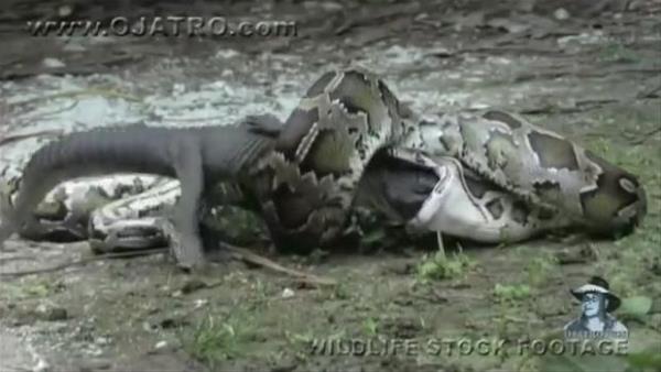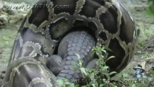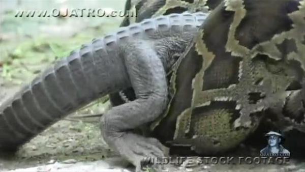 Yakaladığı timsahla bir müddet boğuşan piton onu mideye indirmek için epey uğraştı.