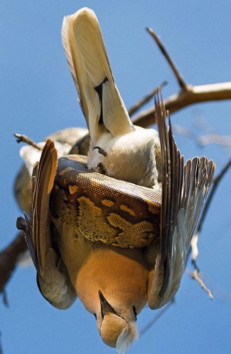 Yakaladığı kuşu sıkıca saran piton boğarak öldürdü.