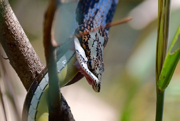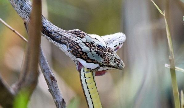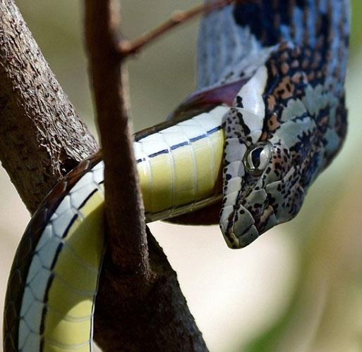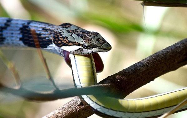 Southern Vine yılanı olarak bilinen bu küçük yılan kendinden daha küçük bir yılanı avladıktan sonra onu tek hamlede yuttu.