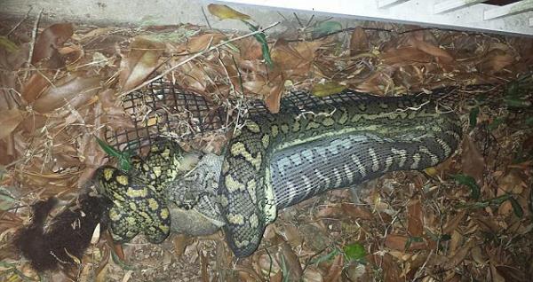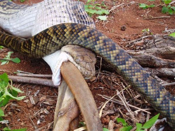 Dünyanın en tehlikeli sürüngenlerinden biri olan piton bebek bir kanguruyu yutarken görüntülendi...