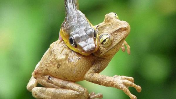 Bir ağaç kurbağasının sıçradığı anda zehirli bir yılan tarafından nasıl havada yakalandığına tanık olun