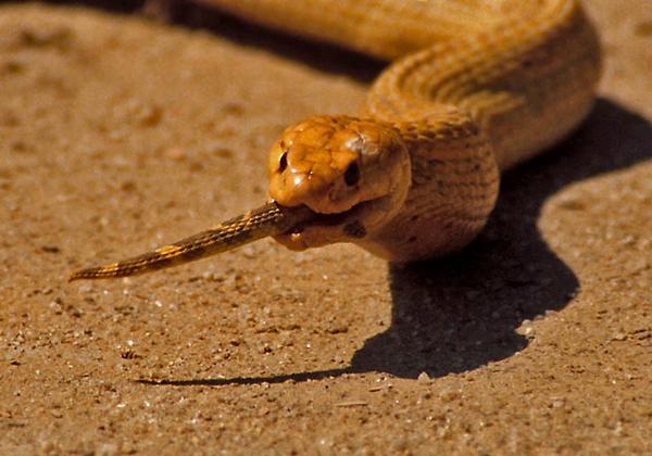 Onu boğmak için yaklaşık yarım saat uğraşan yılan, yarım saatin sonunda sıçanı yutmaya başlıyor...
