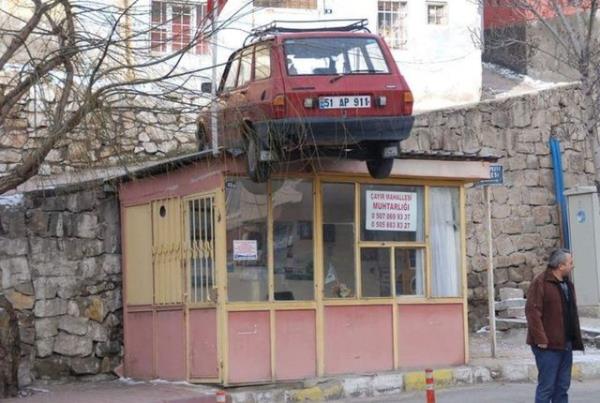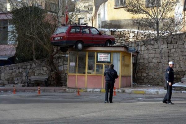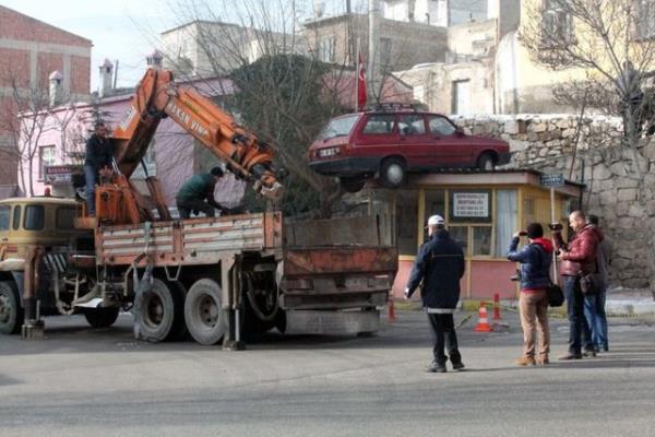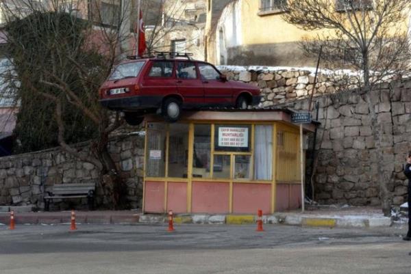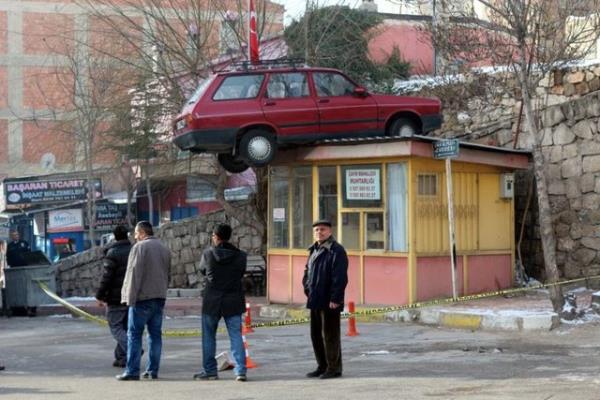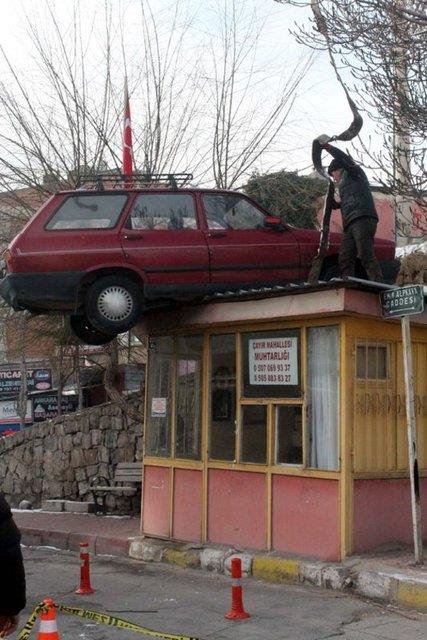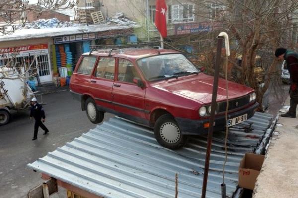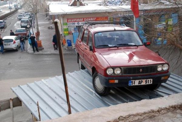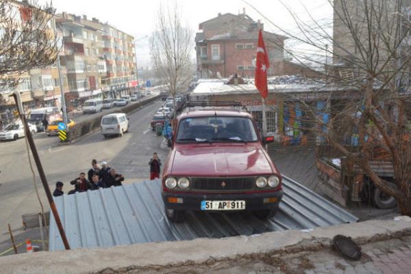 Niğde'de bir sürücü rampaya el frenini çekmeden bıraktığı otomobil çatıya düştü. Olayda can kaybı olmadı.