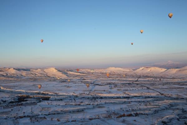 Göreme beldesinden havalanan balonlardan "beyaz Kapadokya"yı izleyen turistler, güneşin doğuşunu takip etti.