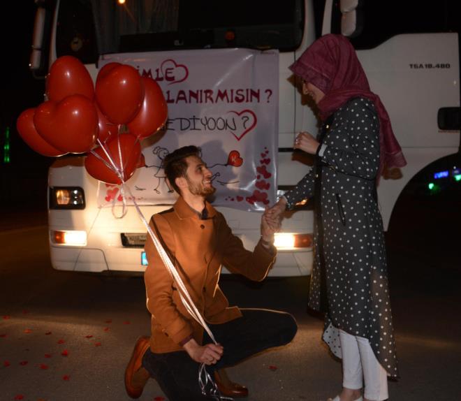 Konya'da nakliyecilik yapan 24 yaşındaki Onur Yılmaz, aynı yaştaki kız arkadaşı Kübra Sütçü'nün içinde bulunduğu otomobilin önünü TIR'la kesip, 'Benimle yaşlanır mısın" yazılı pankart açtı. "Evet" yanıtı alınca da genç kızın parmağına yüzük taktı.