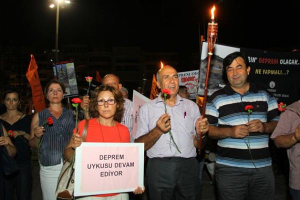 Mahalle Afet Gönüllüleri Derneği (MAG) üyeleri de Deprem Anıtı'ndan başlayarak Cumhuriyet Meydanı'na kadar ellerinde meşalelerle yürüdü. Törende Coşkun, Koçal ve Pehlivan, yürüyüşe katılanlara helva dağıttı. -