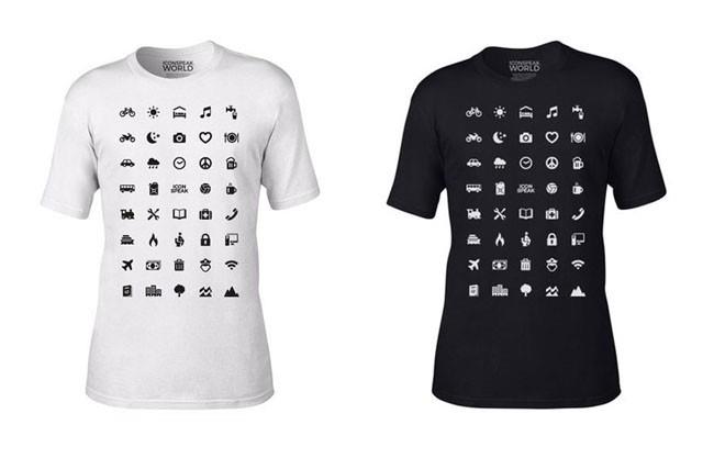 Artık uluslararası hale gelen iconlarla donatılan tişörtte yemekten tamire otelden hastaneye kadar pek çok işaret var.