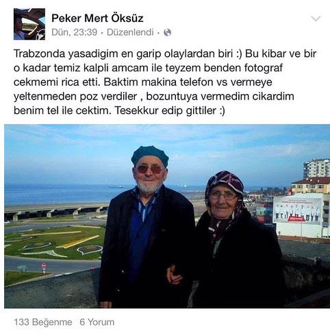 Peker Mert Öksüz, Trabzon’da kendisinden fotoğrafını çekmesini isteyen yaşlı çiftin pozunu Facebook adresinden paylaştı. Fotoğrafın hikayesi oldukça ilginç.