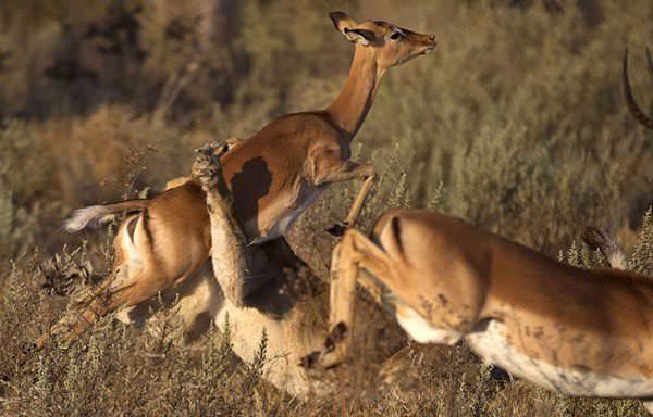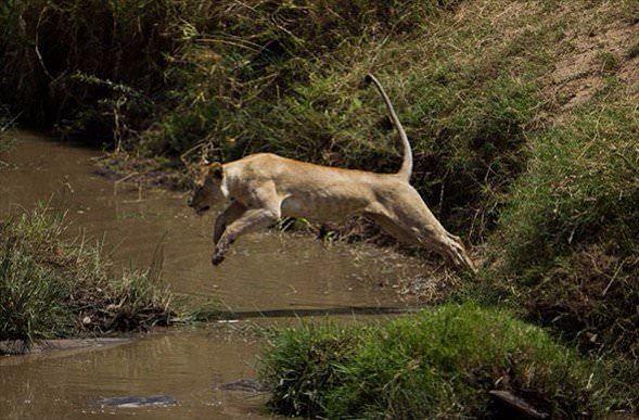 Aç dişi bir aslan zorlu bir kovalamanın ardından ceylanı yakalamayı başarıyor.