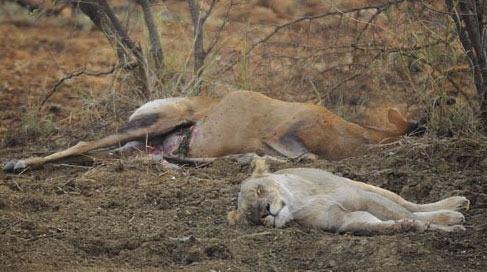 Ceylanın karnından yavaşça yavruyu çıkaran aslan, ceylan yavrusunun üzerinde bulunan atıkları dakikalarca yalayarak temizledi.