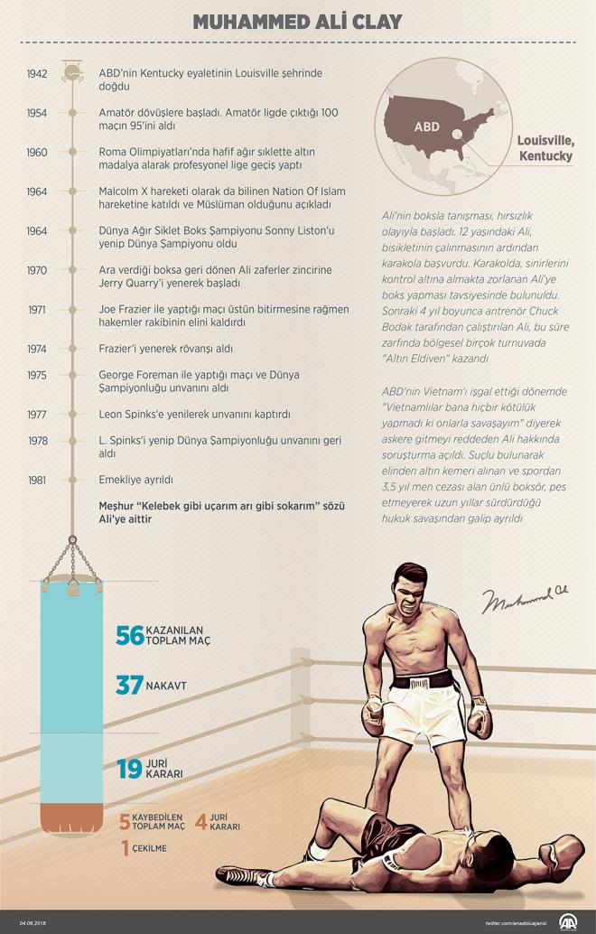 Dünya boksunun en iyisi, ırkçılığa ve İslam düşmanlığına karşı mücadelesiyle efsaneleşen Muhammed Ali, solunum yolu rahatsızlığı nedeniyle tedavi gördüğü hastanede 74 yaşında hayatını kaybetti. Tüm zamanların en iyi ağır sıklet boks şampiyonu olarak kabul edilen Muhammed Ali, kariyerinde 3 kez bu unvana sahip oldu. 1964 yılında Müslüman olan Muhammed Ali, hayırsever kişiliğiyle tanınıyordu.