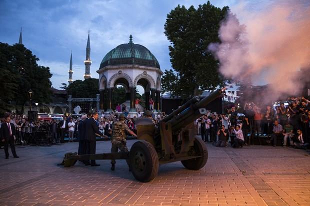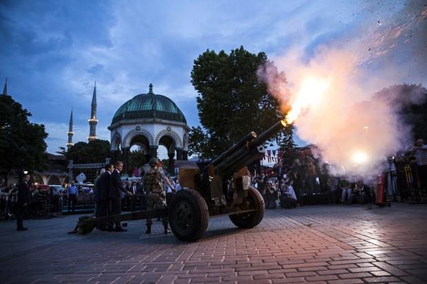 İlahi dinletisinin ve ezanın okunmasının ardından Fatih Belediye Başkanı Mustafa Demir, AK Parti Fatih İlçe Başkanı Ahmet Hamdi Görk ve Fatih Kaymakamı Ahmet Ümit, Mekanize Piyade Tugay Komutanlığı'ndan getirilen gerçek topu, iki askerin kontrolünde ateşledi. Top atışının ardından, binlerce kişi dualar eşliğinde orucunu açtı.