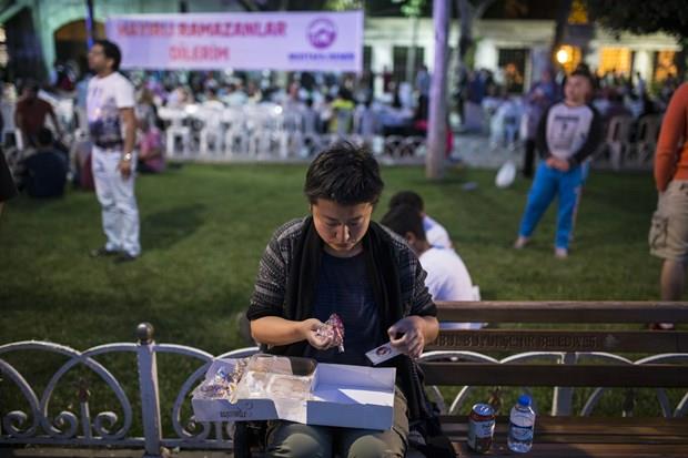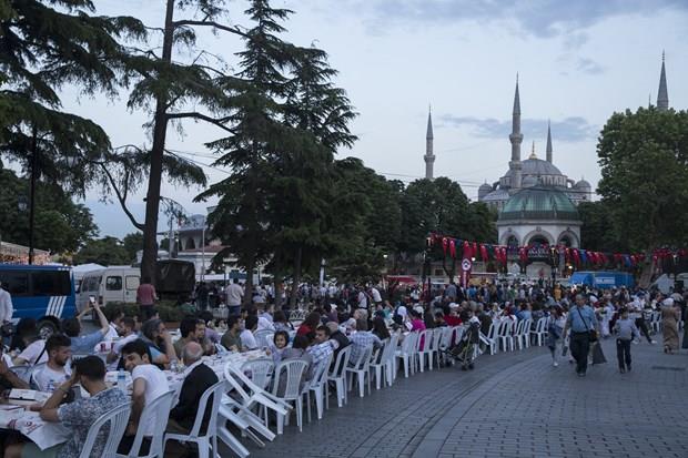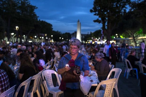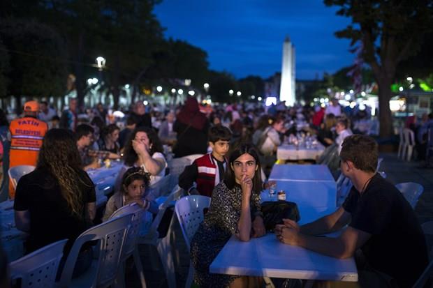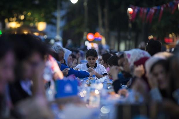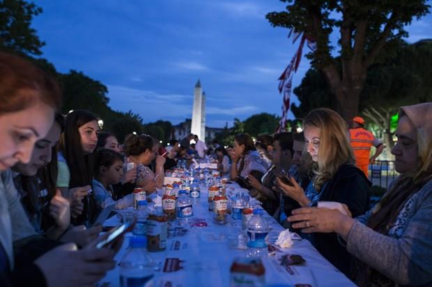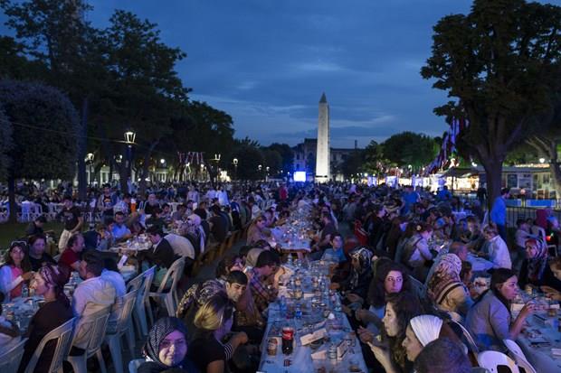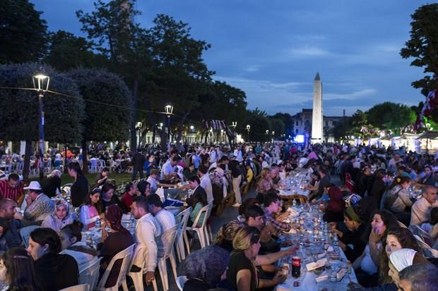 Fatih Belediyesi tarafından düzenlenen program kapsamında, Sultanahmet Meydanı'nda 15 bin kişilik dev iftar sofrası kuruldu.