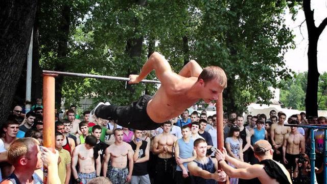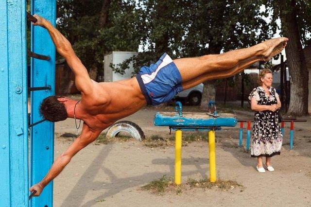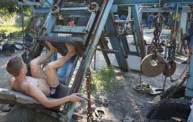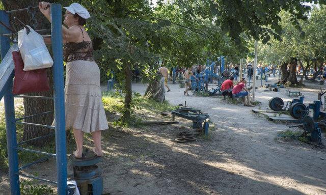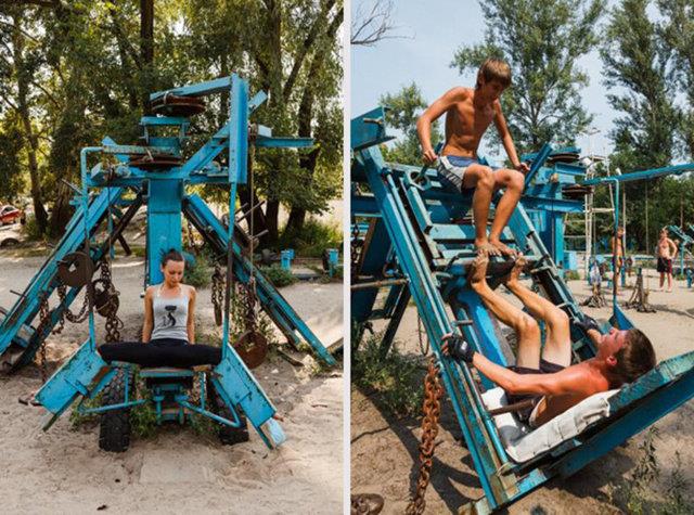 Kiev'de kurulan bu 'açık hava spor salonu'nda bulunan 200 kadar egzersiz aletinin hepsi hurdaya çıkmış metal malzemelerden yapılmış.