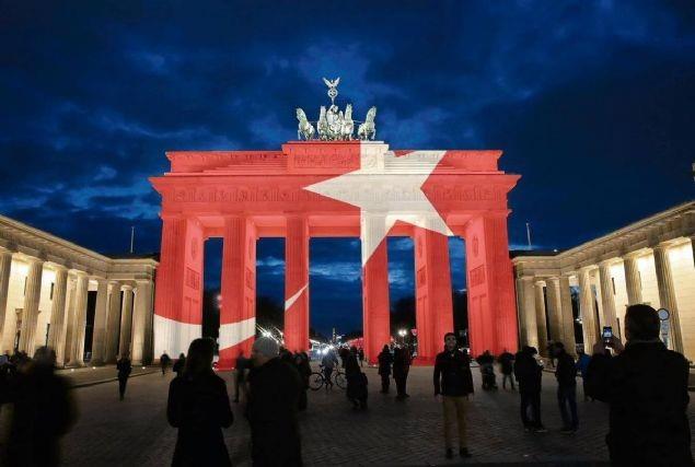 Almanya’nın başkenti Berlin’in en önemli sembollerinden tarihi Brandenburg Kapısı, (Brandenburger Tor) İstanbul'da Atatürk Havalimanı girişinde düzenlenen terör saldırısı sonrasında Türk bayrağının renklerine büründü.