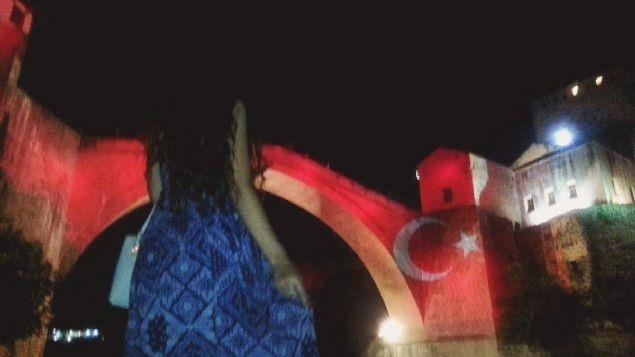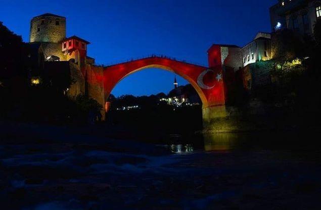 Mostar'daki Barış ve Çok Etnikli İşbirliği Merkezi'nin organizasyonunda, kentin en önemli simgesine Türk bayrağı yansıtılırken, Türkiye'yi hedef alan terör saldırılarının bir an önce sona ermesi mesajı verildi.