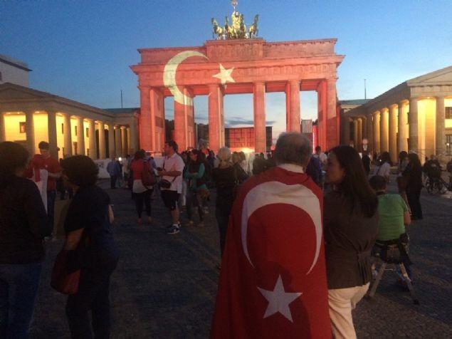 Berlin Eyaleti Başbakanı Michael Müller'in aldığı kararla 'kardeş şehir2 İstanbul ile dayanışma içinde olunduğunu göstermek amacıyla Berlin'deki tarihi Brandenburg Kapısı bu akşam Türk bayrağının renkleriyle ışıklandırıldı.