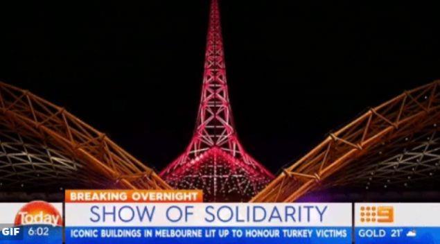 Avustralya Başbakanı Malcolm Turnbull ve Dışişleri Bakanı Julie Bishop’ın İstanbul Atatürk Havalimanı’ndaki terör saldırısını kınayan açıklamalarının ardından Victoria eyaletindeki bazı binalar Türk bayrağının renkleriyle ışıklandırıldı.
