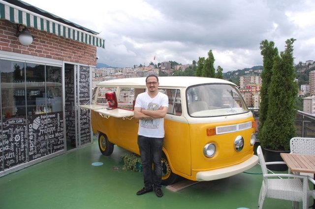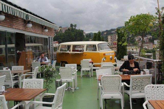 Rize’deki bir plazanın terasında bulunan cafeyi işleten Özay Topuk, yaz aylarındaki bar ihtiyacını karşılamak için 11. kata minibüs çıkardı.