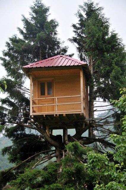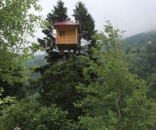 BALKONA DEĞİL BOŞLUĞA AÇILAN KAPI Rize’nin Hemşin İlçesi’ne bağlı Çamlıtepe Köyü’nde de Sezai Yüce, yaklaşık 35 metrelik bir çam ağacının 30. metresine balkonu da olan bir ağaç ev yaptı.