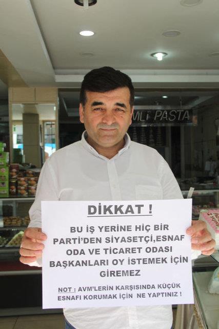 Küçük esnafın Alışveriş Merkezleri karşısında korunmamasına isyan eden Bursalı pastacı, işyerinin girişine, "Bu işyerine siyasiler ve oda başkanları giremez" yazısını asarak protesto yapıyor.