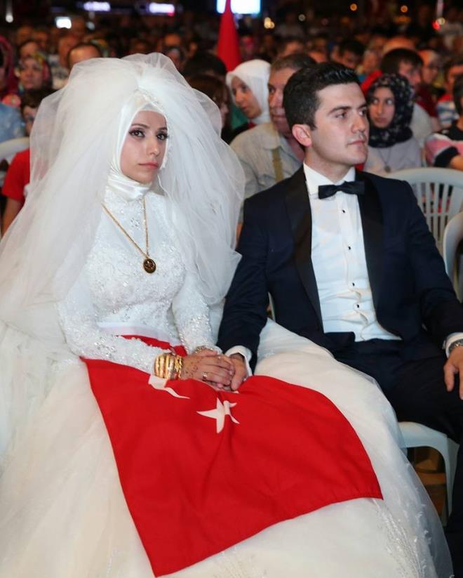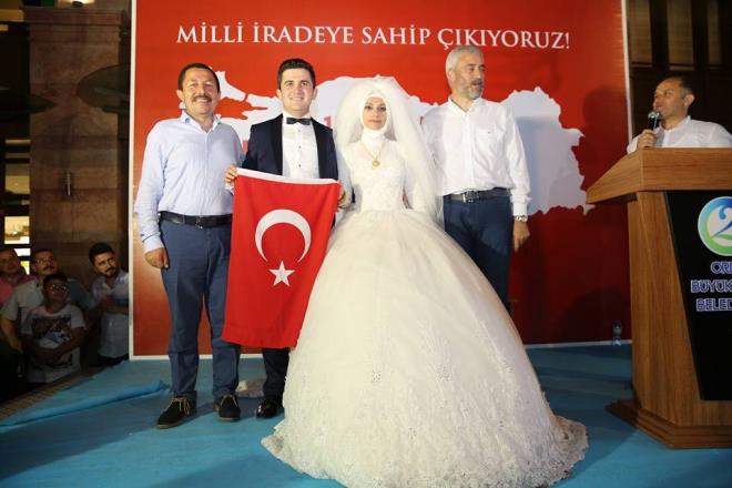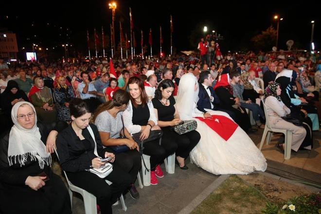 Düğün törenlerini erken bitiren Samet Akbaş ve Ebru Köseli (Akbaş), "demokrasi meydanına" gelerek darbe girişiminde şehit olan asker, polis ve vatandaşlar için okunan Kur’an-ı Kerim tilavetine katıldı.