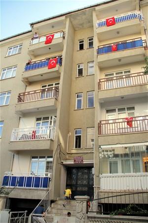 Bu bayraklar o geceden bu yana dükkanlara, yollara, büyük binalara asılanlardan farklı. Bu kez gelip geçene buradan bir kişinin hayatını darbe girişiminde kaybettiğini söylemek için orada.