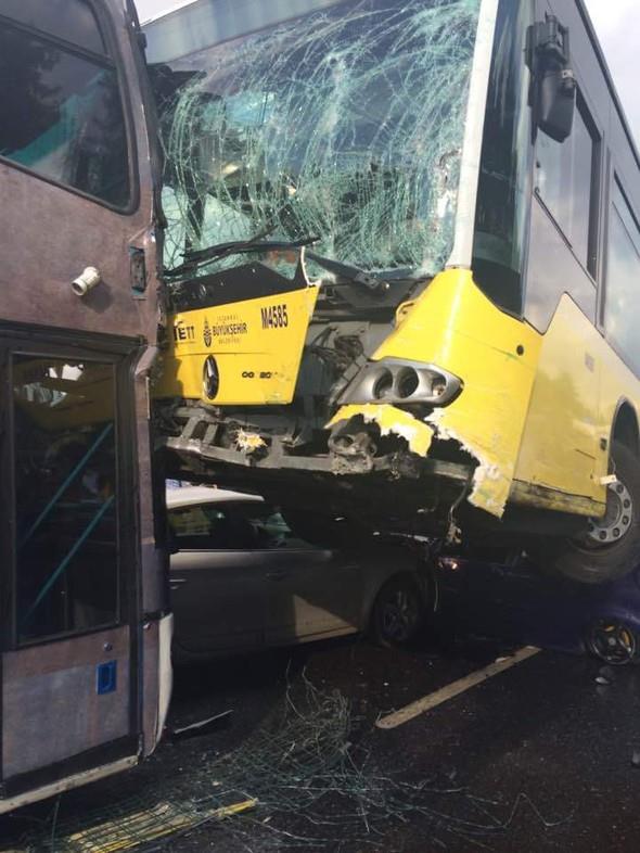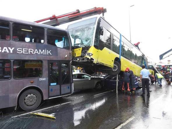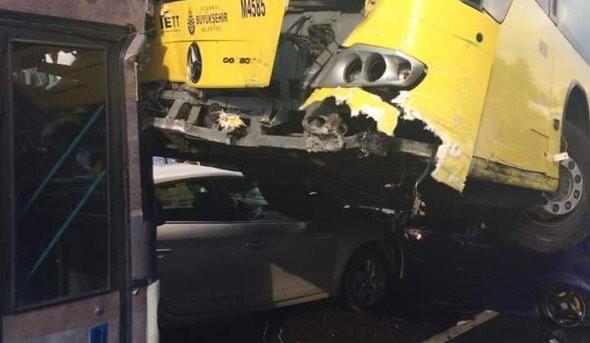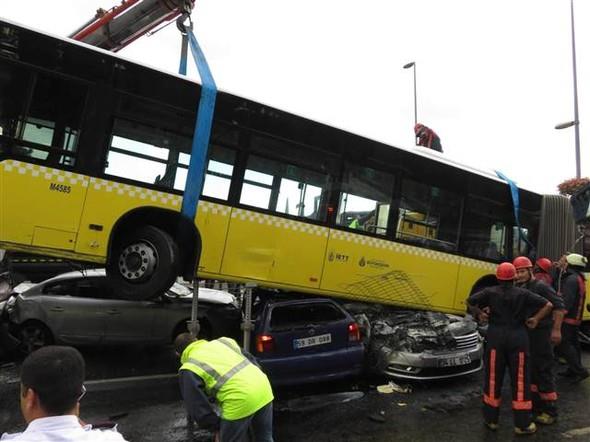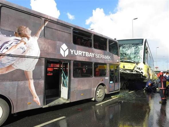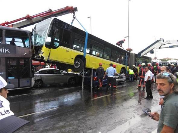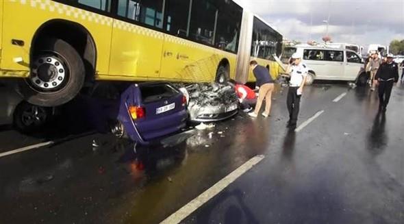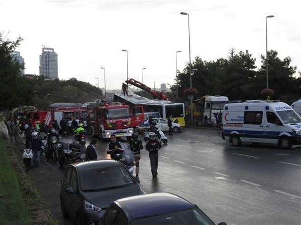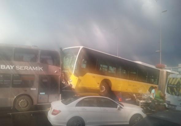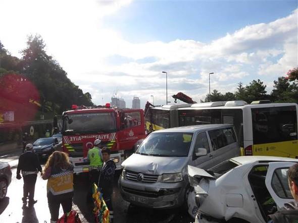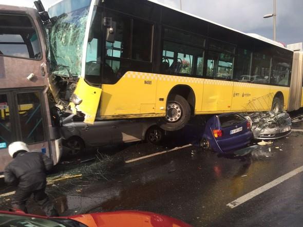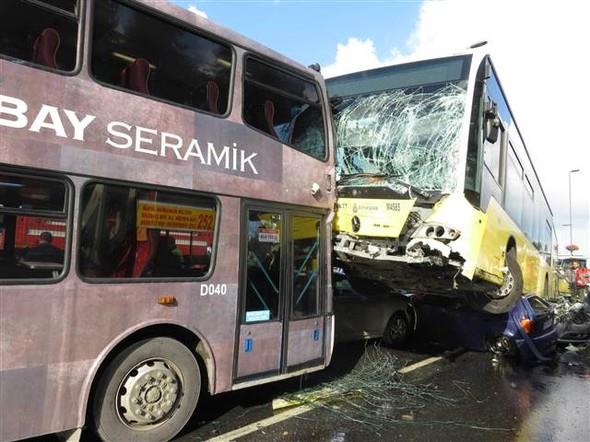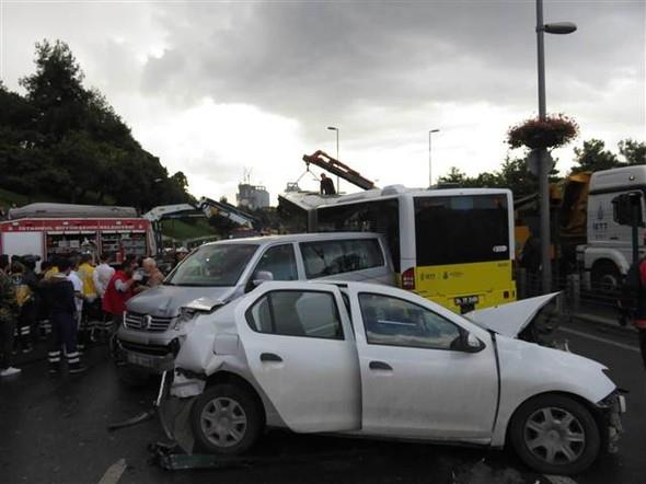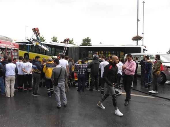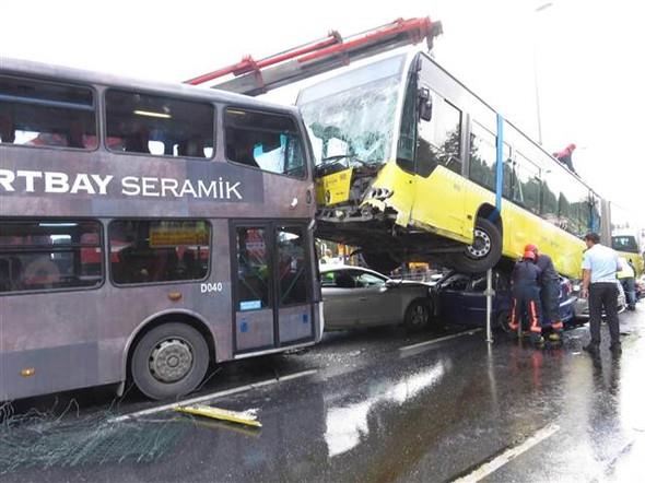 Acıbadem durağında yoldan çıkan metrobüs, önce karşı yönden gelen çift katlı belediye otobüsüne, ardından da diğer araçlara çarparak 4 aracı altına aldı.