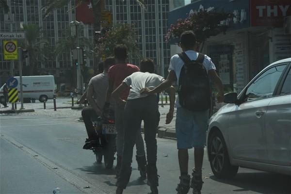 Okulların açılması ve haftanın ilk günü olması nedeniyle İzmir'de trafik yoğunluğu oluşurken, yolda engelli bir vatandaşın yaptığı görenlere 'pes' dedirtti.