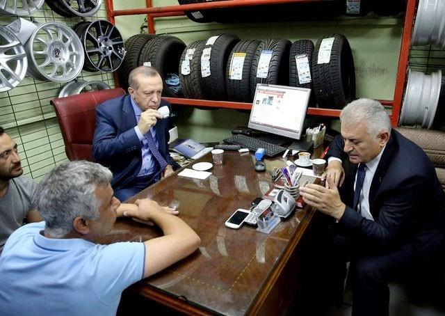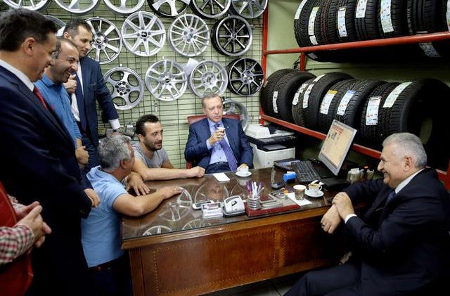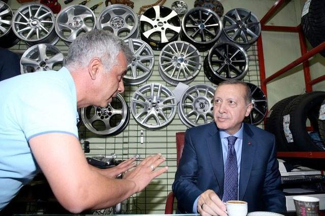 Araç lastiği satan esnafın dükkanına konuk olan Erdoğan ve Yıldırım, iş yeri sahibi ve çalışanlarıyla bir süre sohbet etti ve birlikte çay içti.