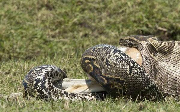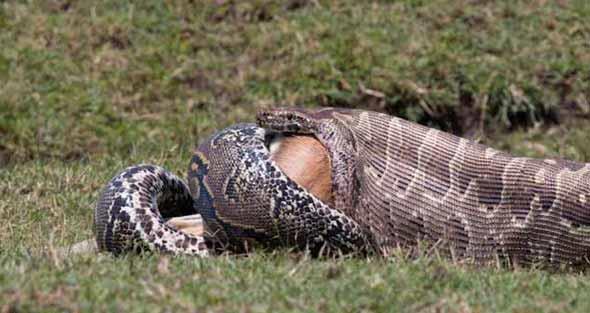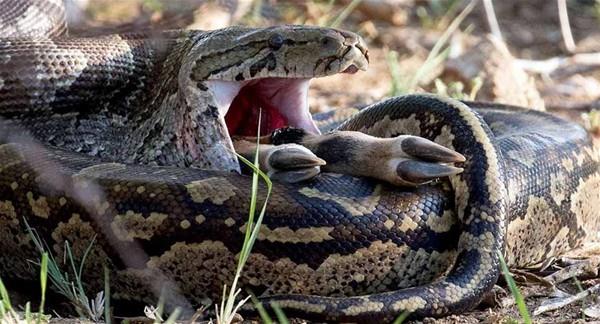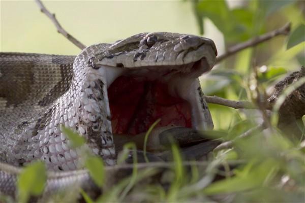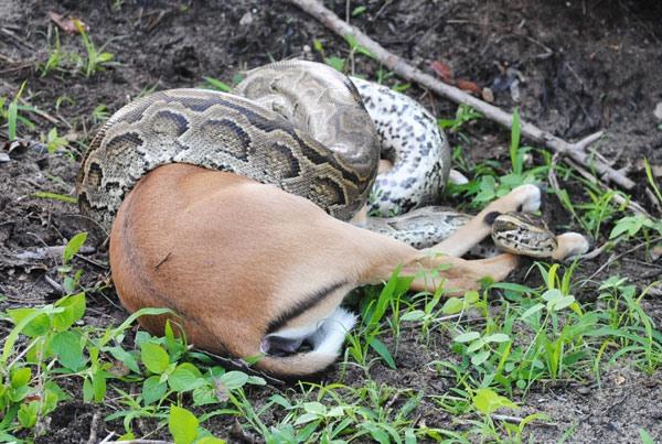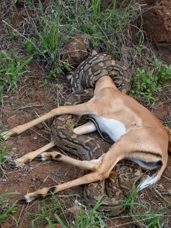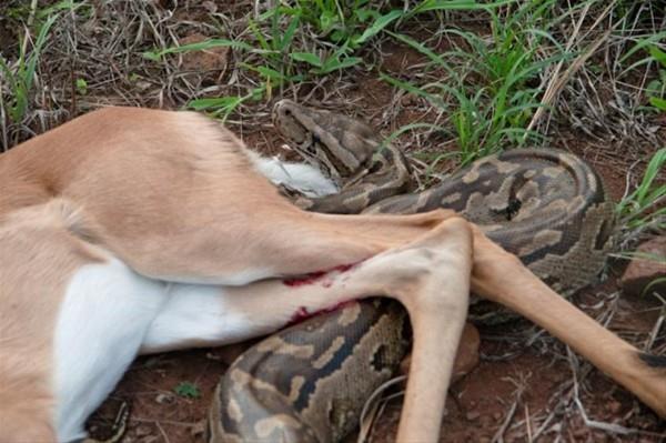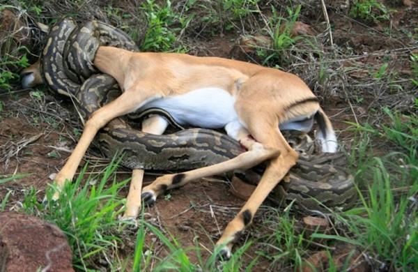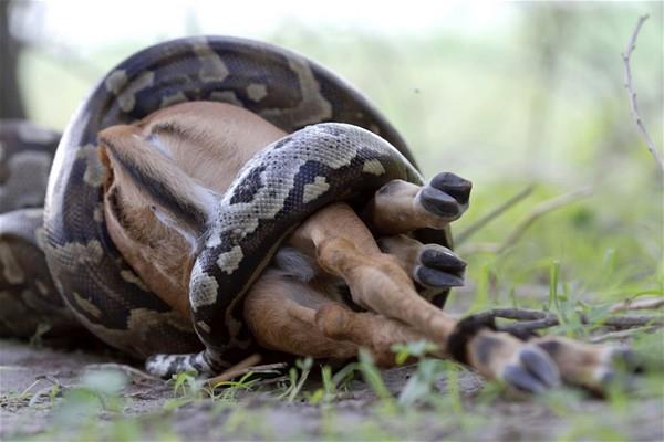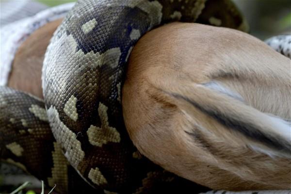 Piton, saklandığı çalılığın yanındaki antilopun üstüne atladı. Saniyeler içinde sarıp sarmaladığı hayvanı yere indirdi.