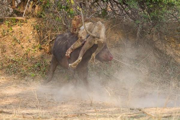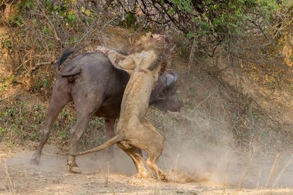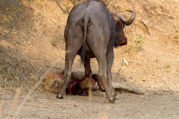 Keskin boynuzlarını aslanın yüzüne ve dişlerine rast getiren bufalo, aslanı öldürmeyi başardı.