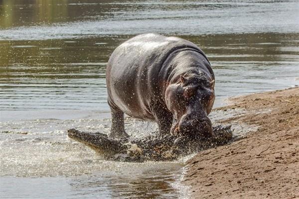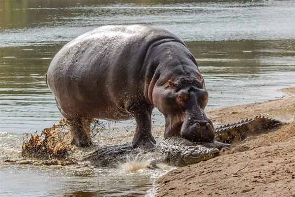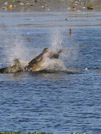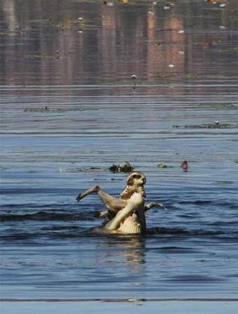 Pusuda bekleyen timsahı fark eden anne, timsahtan önce davrandı ve annelik güdüleriyle düşmanına saldırdı.
