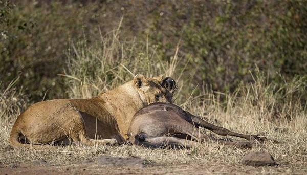 Düşmanından habersiz otlayan antilop aslanı üstüne atladığında farkedebildi.