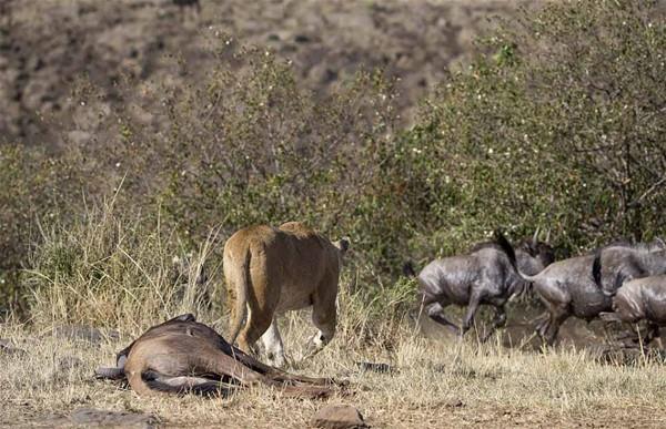Kenya'da aç bir aslan peşine düştüğü öküzbaşlı antiloplardan birisinin ardından sinsice yaklaştı.