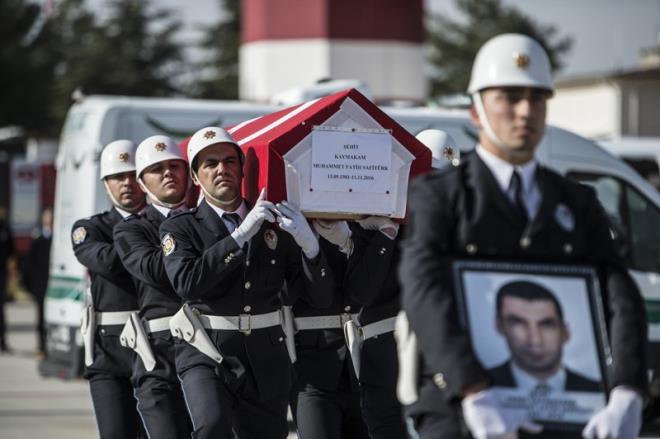 Mardin'in Derik Kaymakamlığına PKK'lı teröristlerce el yapımı patlayıcı ile düzenlenen saldırıda yaralanan ve tedavi gördüğü hastanede şehit olan Kaymakam Muhammet Fatih Safitürk için Gaziantep Havalimanında tören düzenlendi.