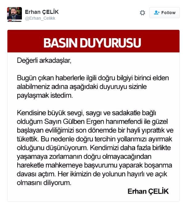 Twitter hesabından bir basın duyurusu yayınlayan Çelik boşanacaklarını açıkladı: