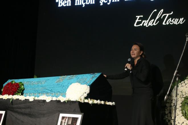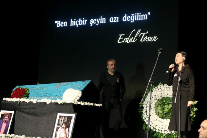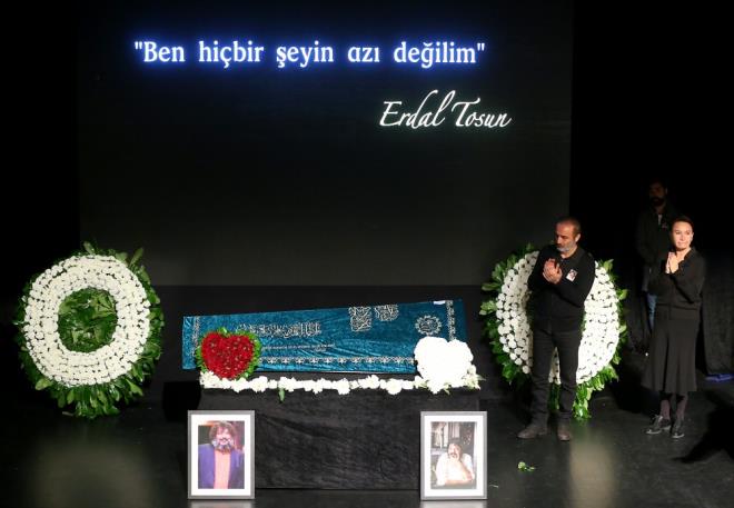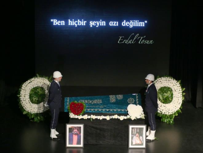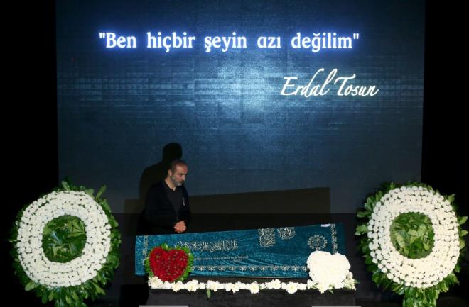 "Ben hiçbir şeyin azı değilim" Saat 12:15'de başlayan törende sahneye siyah zeminde Erdal Tosun'un "Ben hiçbir şeyin azı değilim" sözü yansıtıldı. Kalp şeklinde iki çiçek Erdal Tosun'un tabutunun önüne konuldu.