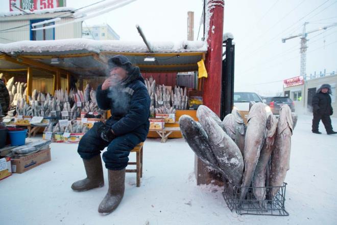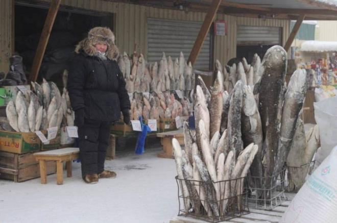 Sıcaklığın -48 dereceye kadar ulaştığı şehirde, kaskatı kesilmiş balıklar ekmek gibi yan yana diziliyor.