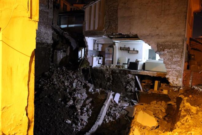 Çalışmaların yapıldığı arsanın yanındaki iki katlı binanın yan duvarı sabaha karşı çöktü. Çökme nedeniyle bina sakinleri evlerini boşalttı.