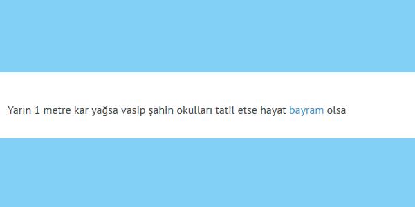 Yoğun kar yağışı ve kış şartları gerekçesiyle bugün Ankara da dahil birçok kentte okullar tatil edildi. Meteoroloji'nin İstanbul için kar yağışı uyarısı yapmasının ardından öğrenciler 'Bugün İstanbul'da okullar tatil mi' sorusuna kilitlendi. Kar tatili beklentisi içindeki öğrenciler İstanbul Valisi Vasip Şahin’e Twitter’dan esprili mesajlar göndererek tatil isteklerini duyurdular.
