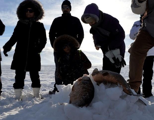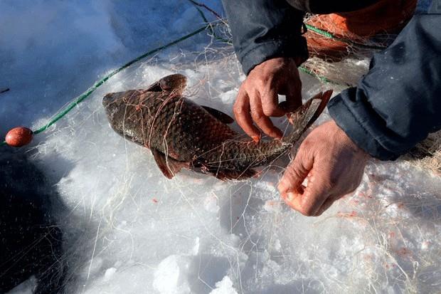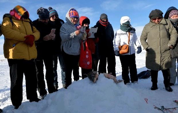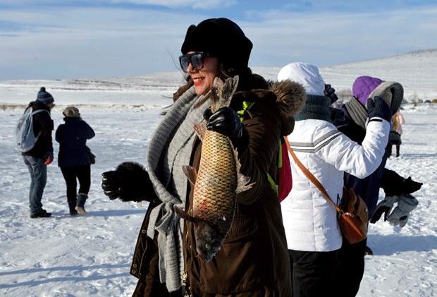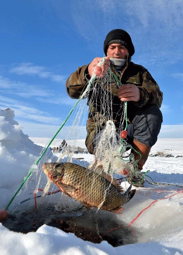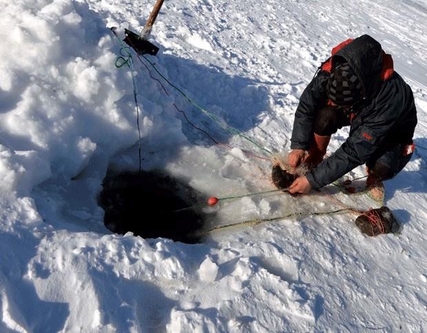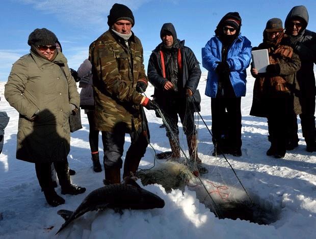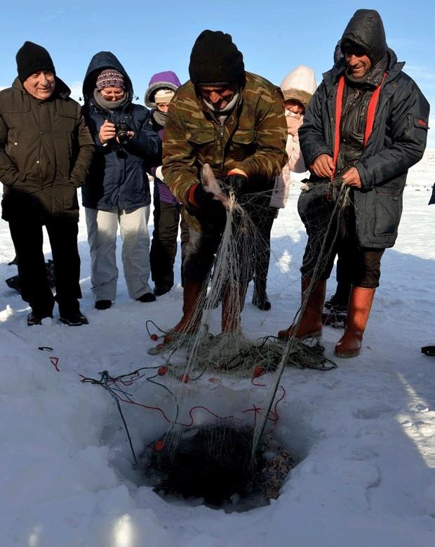ARDAHAN'daki Çıldır Gölü'nü ziyaret eden turistler ve yerliler, eskimo usulü balık tutuyorlar. Ortaya film sahnelerini aratmayan görüntüler çıkıyor.
