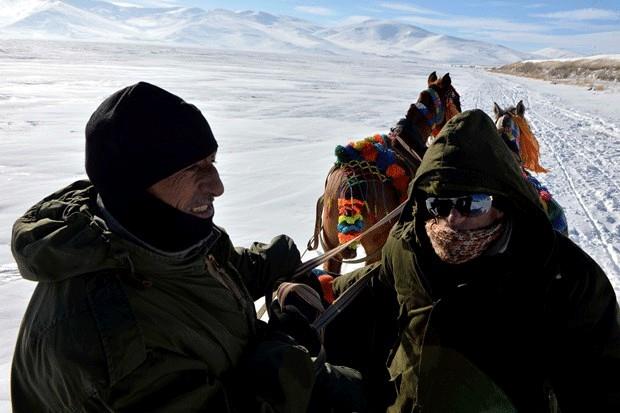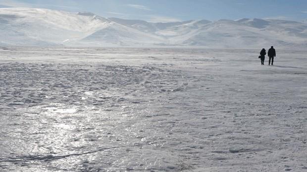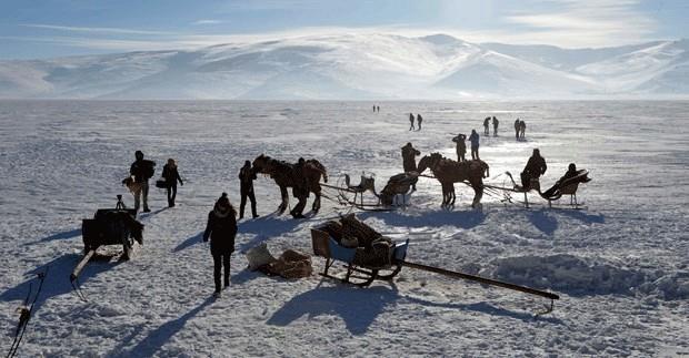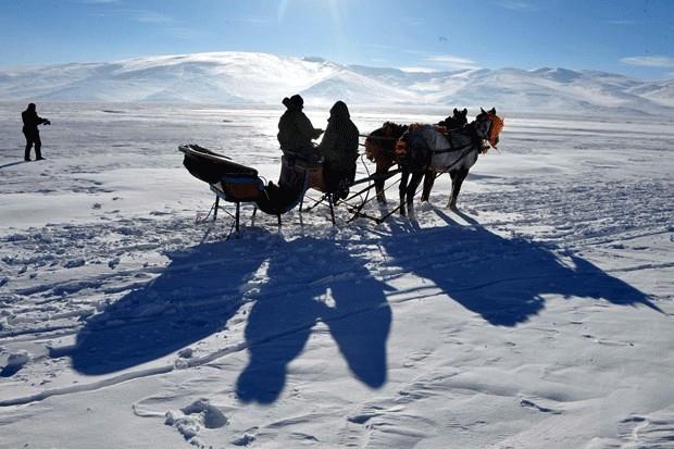 Ardahan'daki Çıldır Gölü'nü ziyaret eden yerli turistler, atlı kızaklarla dolaşmanın yanı sıra "eskimo usulü" balık tutarak vakit geçiriyor.