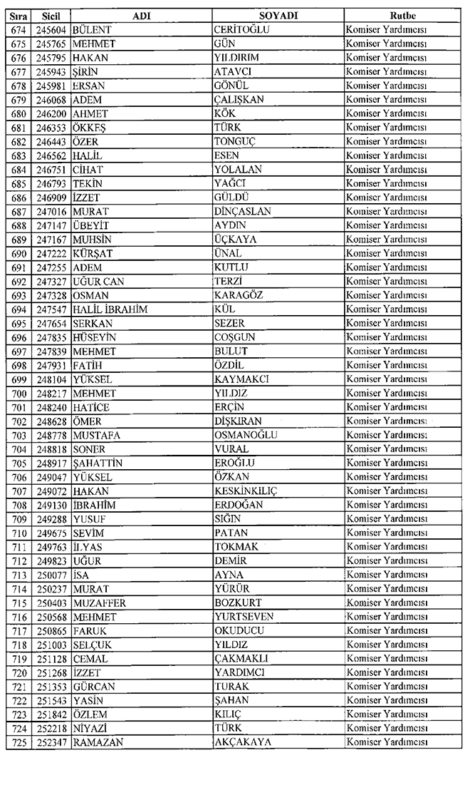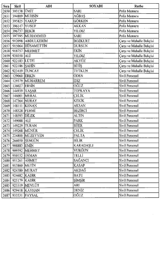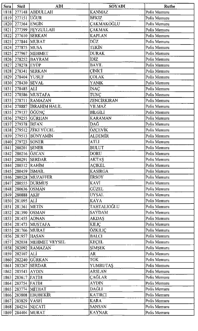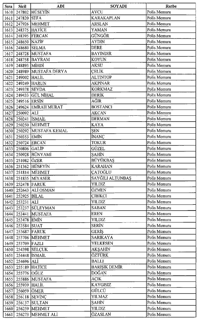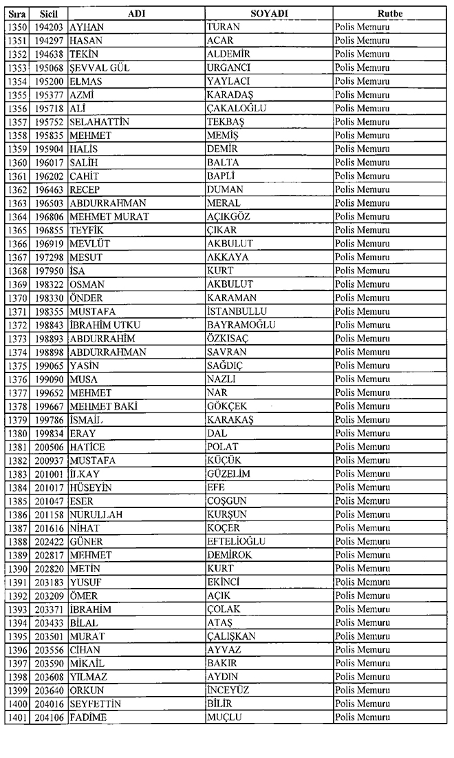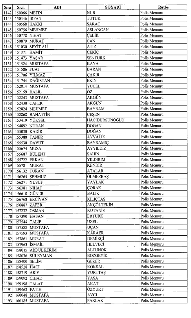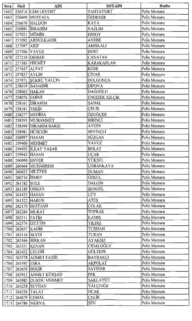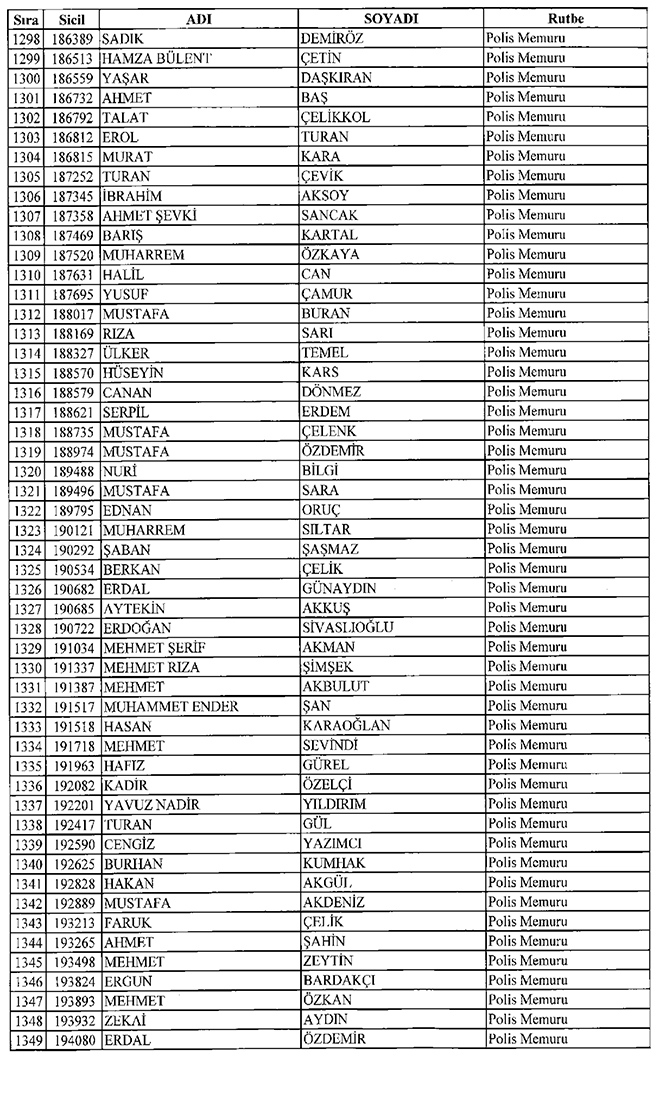 679 sayılı KHK ile Emniyet'ten ihraç edilenlerin listesi
